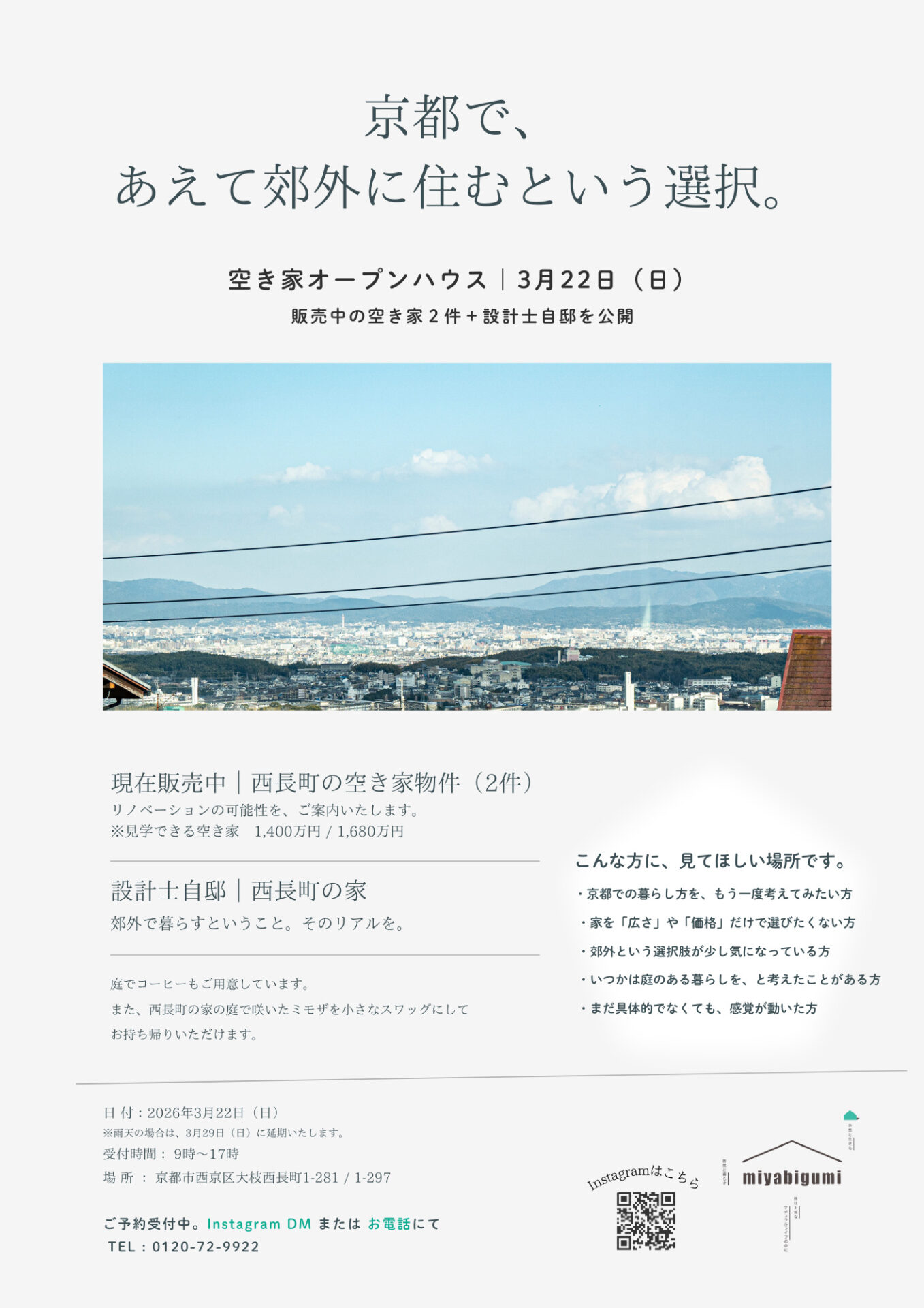 現在販売中の空き家2件と、設計士自邸「西長町の家」をご案内します。